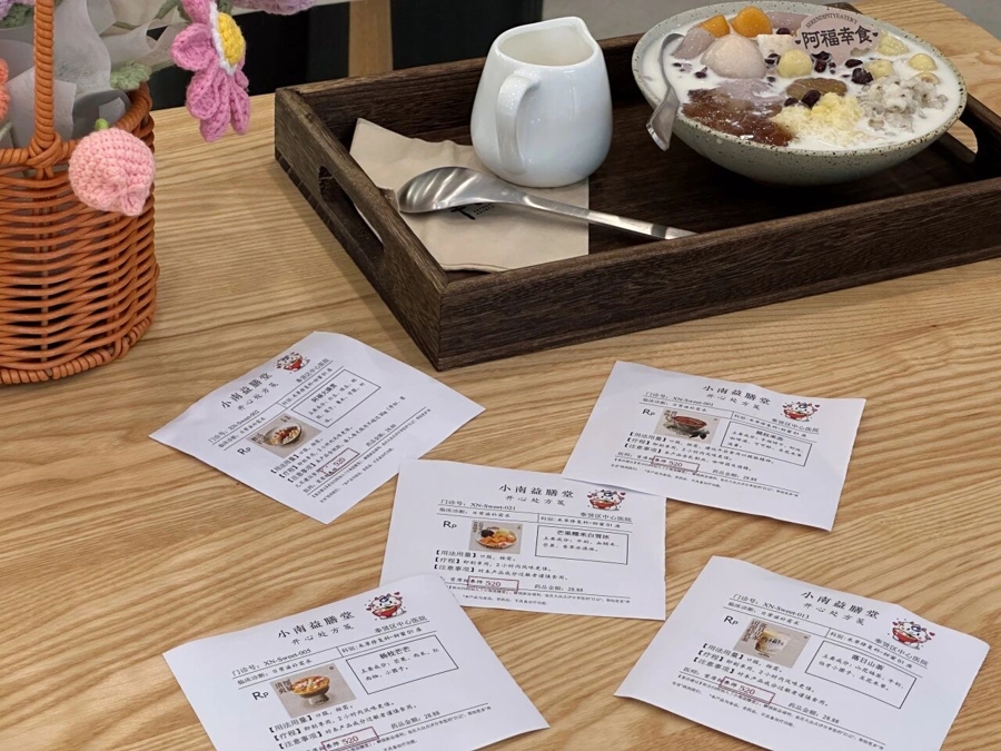 柜台后“卧虎藏龙”,落座区也是充满惊喜:每周在同名小程序中,都会预告中医专家的现场坐诊时段。“不同体质人群适合的食材总归有差异,能和医生聊一聊,既专业又放心。”诸海英透露,目前团队也正在探索完善“开心处方”便签,标明各产品的食材、功效,也可收集反馈顾客的意见。