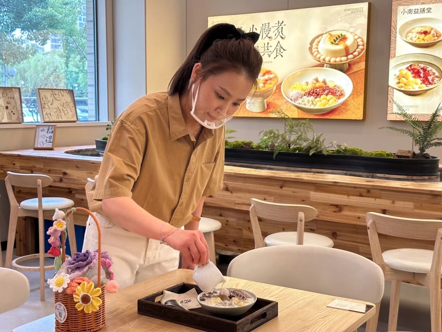 正式开业一周,销量最高的明星产品是“大满贯”,已售出621份。赤小豆、去皮绿豆、桃胶、莲子、薏米、芋圆、奶冻……满满一碗再淋上鲜奶,本身就自带清甜滋味的食材规避了过度摄入糖分的风险,成了兼备“润”“养”的健康享受。